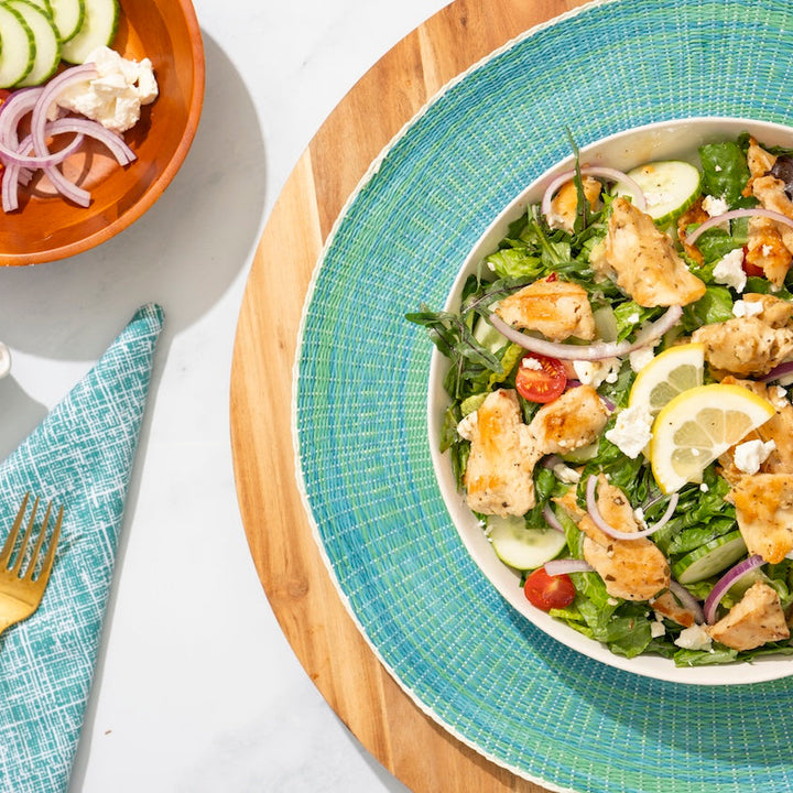 To assemble the salad, add the lettuce to a large serving bowl or platter. Scatter red onion, cucumber, tomatoes, and feta over the top. Top with Kevin’s Greek-Style Lemon Chicken and drizzle with dressing. Serve and enjoy!