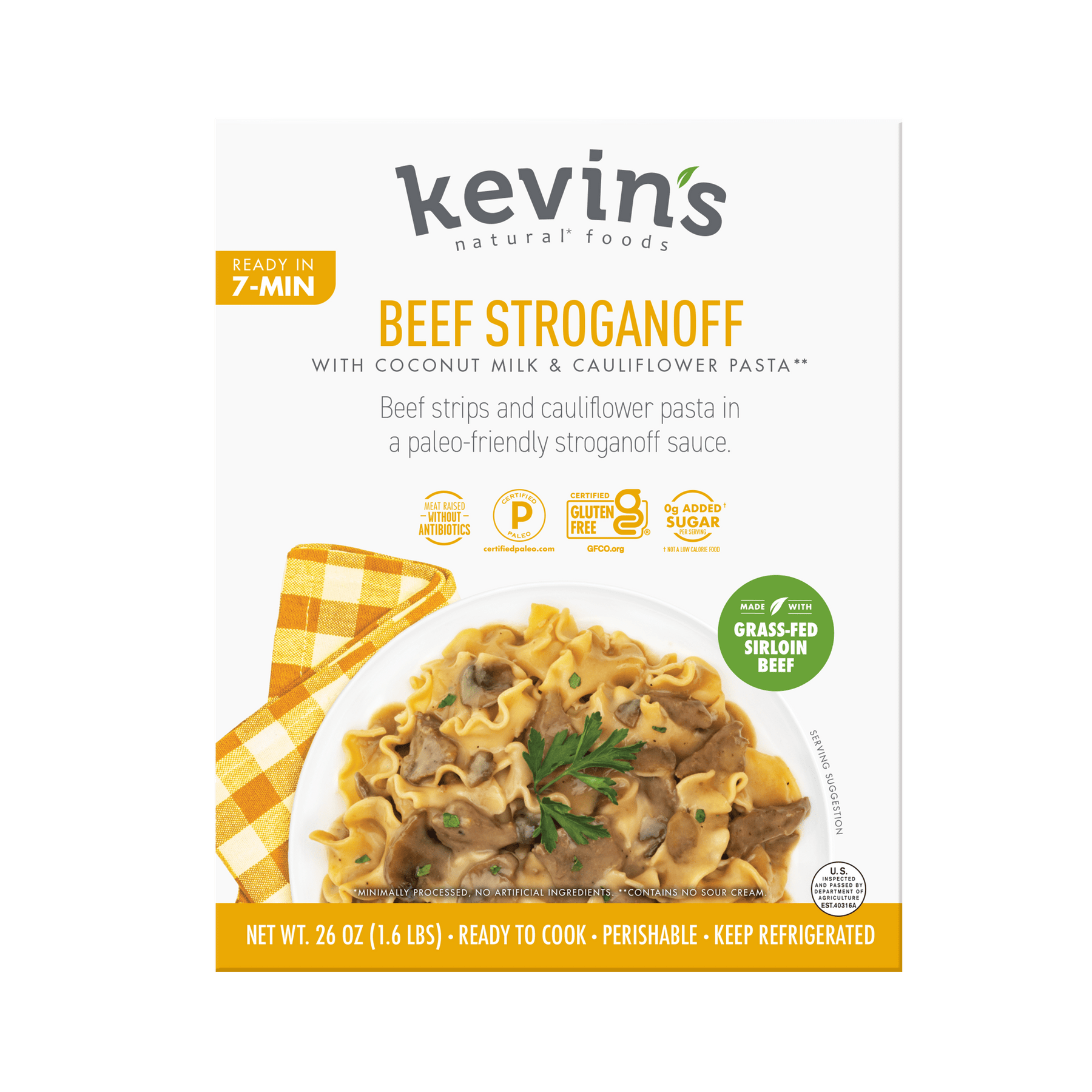 Stroganoff Sauce (Top Sirloin Beef Strips, Mushrooms, Water, Coconut Milk [Coconut Cream, Water], Onion, Clarified Butter [Milk], Chablis Wine, Chicken Stock [Chicken Stock, Salt], Chicken Fat, Yeast Extract, Dehydrated Roasted Garlic, Tapioca Starch, Xanthan Gum, Dehydrated Mushroom, Black Pepper, Spice), Cauliflower Pasta (Water, Cauliflower Powder, Potato Starch, Tapioca Starch, Whole Egg, Egg White, Xanthan Gum, Salt, Konjac).