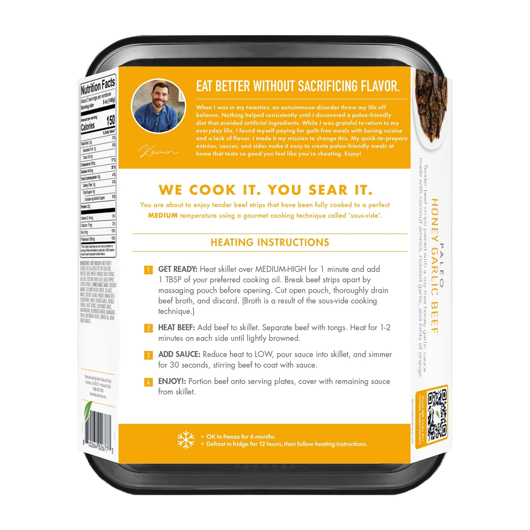 Grass-Fed beef in beef broth cooked out as a result of the sous-vide process (Beef, Water, Vinegar, Yeast Extract, Onion Powder, Sea Salt, Black Pepper, Citrus Extract), Honey Garlic Sauce (Coconut Aminos [Coconut Nectar, Water, Sea Salt], Water, Coconut Sugar, Vinegar, Honey, Orange Juice Concentrate, Roasted Garlic, Tapioca Starch, Dehydrated Garlic, Yeast Extract, Xanthan Gum, Dehydrated Ginger, Granulated Onion, Dehydrated Chilies, Orange Oil, Monk Fruit Extract).