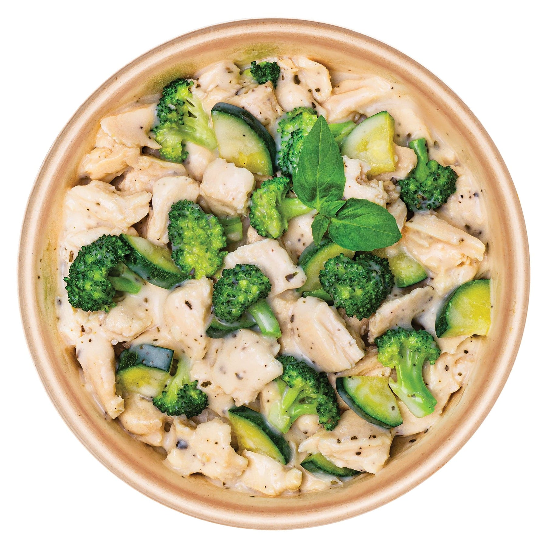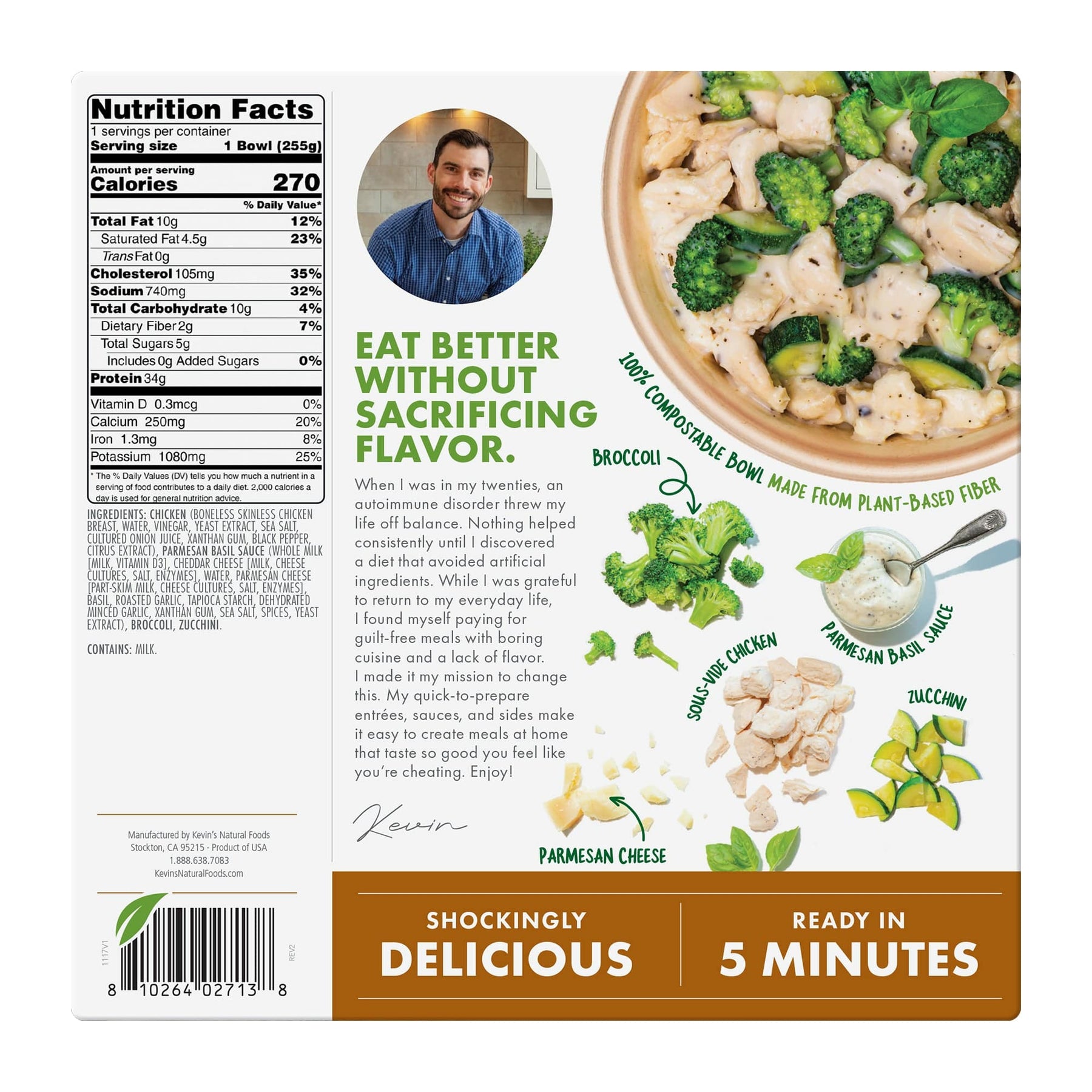Chicken (Boneless Skinless Chicken Breast, Water, Vinegar, Yeast Extract, Sea Salt, Cultured Onion Juice, Xanthan Gum, Black Pepper, Citrus Extract), Parmesan Basil Sauce (Whole Milk [Milk, Vitamin D3], Cheddar Cheese [Milk, Cheese Cultures, Salt, Enzymes], Water, Parmesan Cheese [Part-Skim Milk, Cheese Cultures, Salt, Enzymes], Basil, Roasted Garlic, Dehydrated Minced Garlic, Xanthan Gum, Sea Salt, Spices, Tapioca Starch, Yeast Extract), Broccoli, Zucchini.