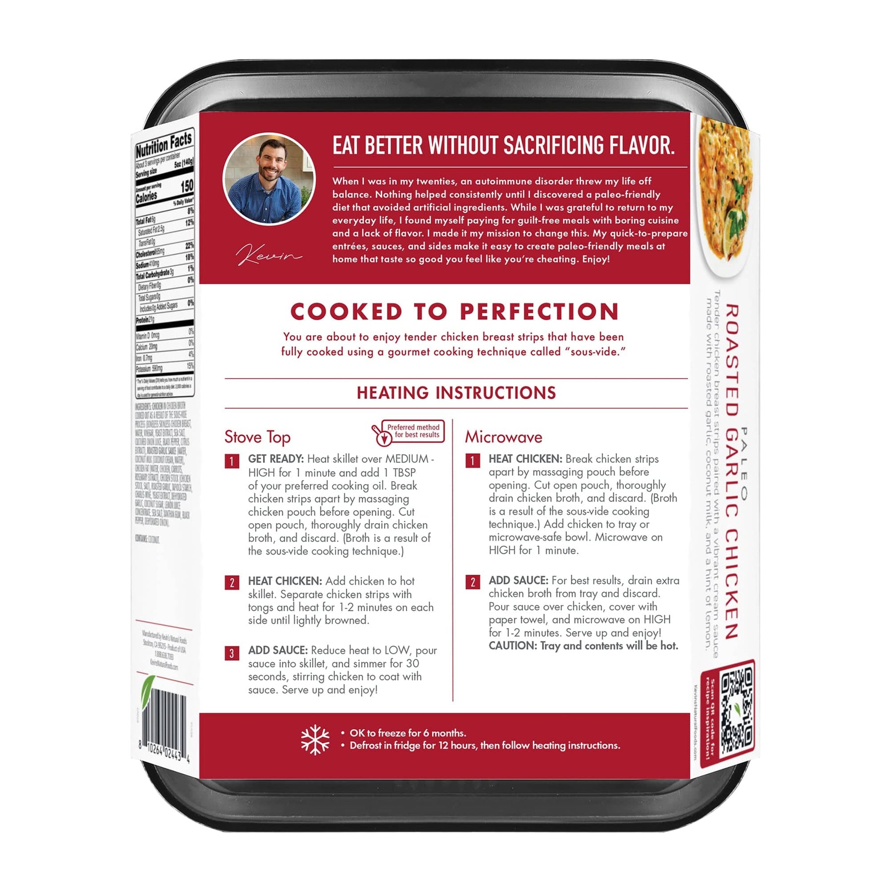 Chicken in chicken broth cooked out as a result of the Sous-Vide process (Boneless Skinless Chicken Breast, Water, Vinegar, Yeast Extract, Sea Salt, Onion Powder, Black Pepper, Citrus Extract), Roasted Garlic Sauce (Water, Coconut Milk [Coconut Cream, Water], Chicken Fat, Chicken Stock [Chicken Stock, Salt], Tapioca Starch, Roasted Garlic, Chablis Wine, Yeast Extract, Dehydrated Garlic, Coconut Sugar, Lemon Juice Concentrate, Sea Salt, Xanthan Gum, Black Pepper, Dehydrated Onion).