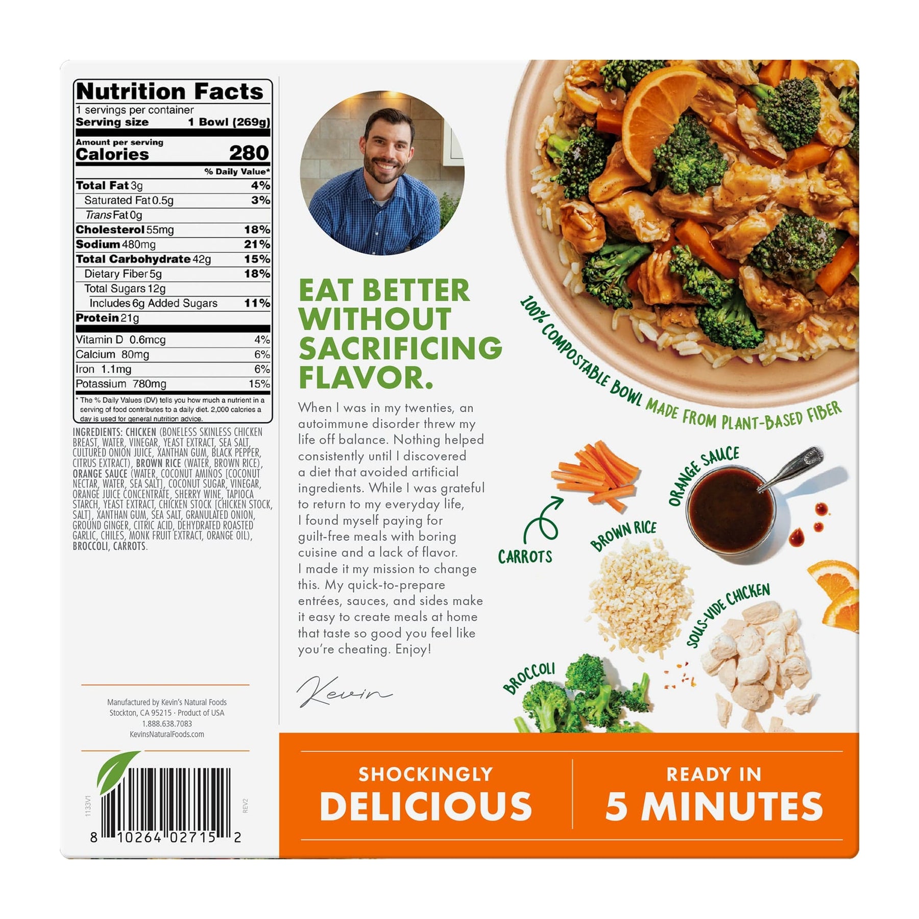 Just finished a practically perfect Orange Chicken dinner from Kevin's. It was a perfect size (filling) meal for a single person, healthy (for an elder who needs good nutrition), just the right balance of protein and vegetables, all cooked to a great taste. Loved it! I have just one recommendation for absolute perfection: Please add more orange sauce to the mix. The sauce is quickly absorbed into the rice and isn't enough to lightly coat the chunks of chicken. It really needs a little more pizazz to get the full flavor throughout the meal. Thanks for making good food at an affordable price. Now, if you could just flavor it up a bit, I'd give it 5 stars!