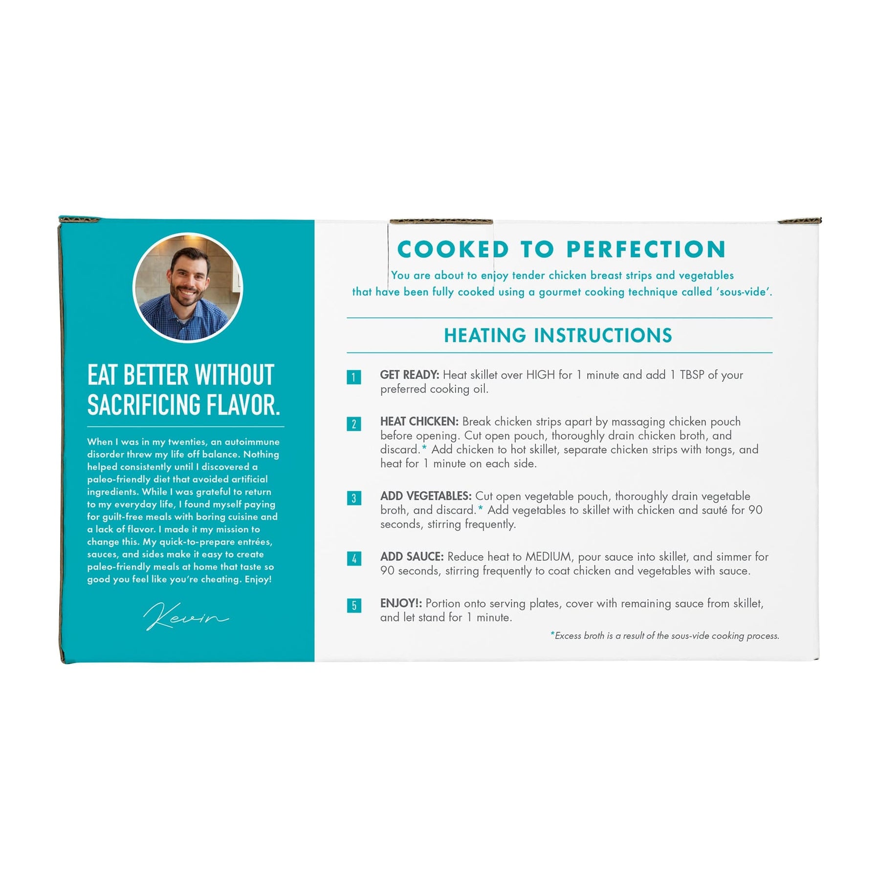 Tender chicken breast strips and sous-vide vegetables paired with a soy-free teriyaki sauce made with coconut aminos, ginger, and garlic.